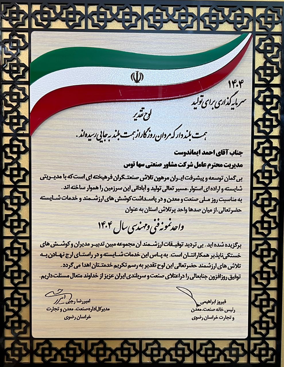 In addition, Sohatoos Industrial Consulting Company was recognized as The Technical and Engineering Model Unit of the year 1404(2025).