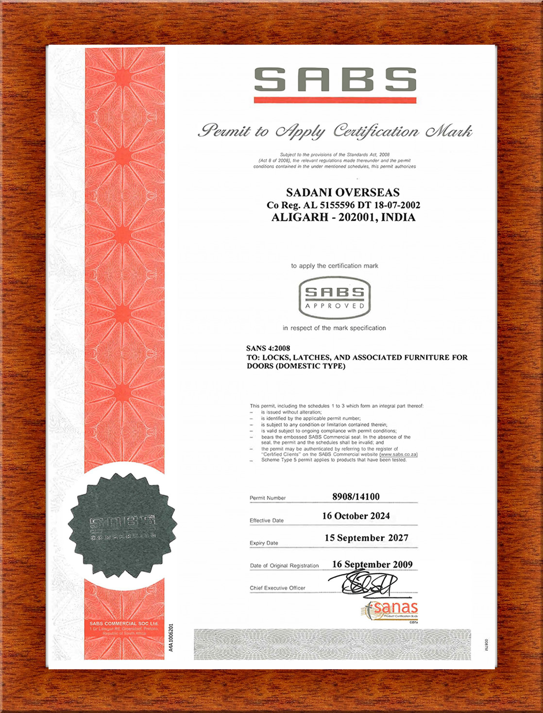 _ آن کالا ممکن است اجازه داشته باشد نشان «SABS Approved» یا لوگوی مربوط به گواهی را درج کند؛ که نشانگر کیفیت، ایمنی یا عملکرد مورد قبول است.